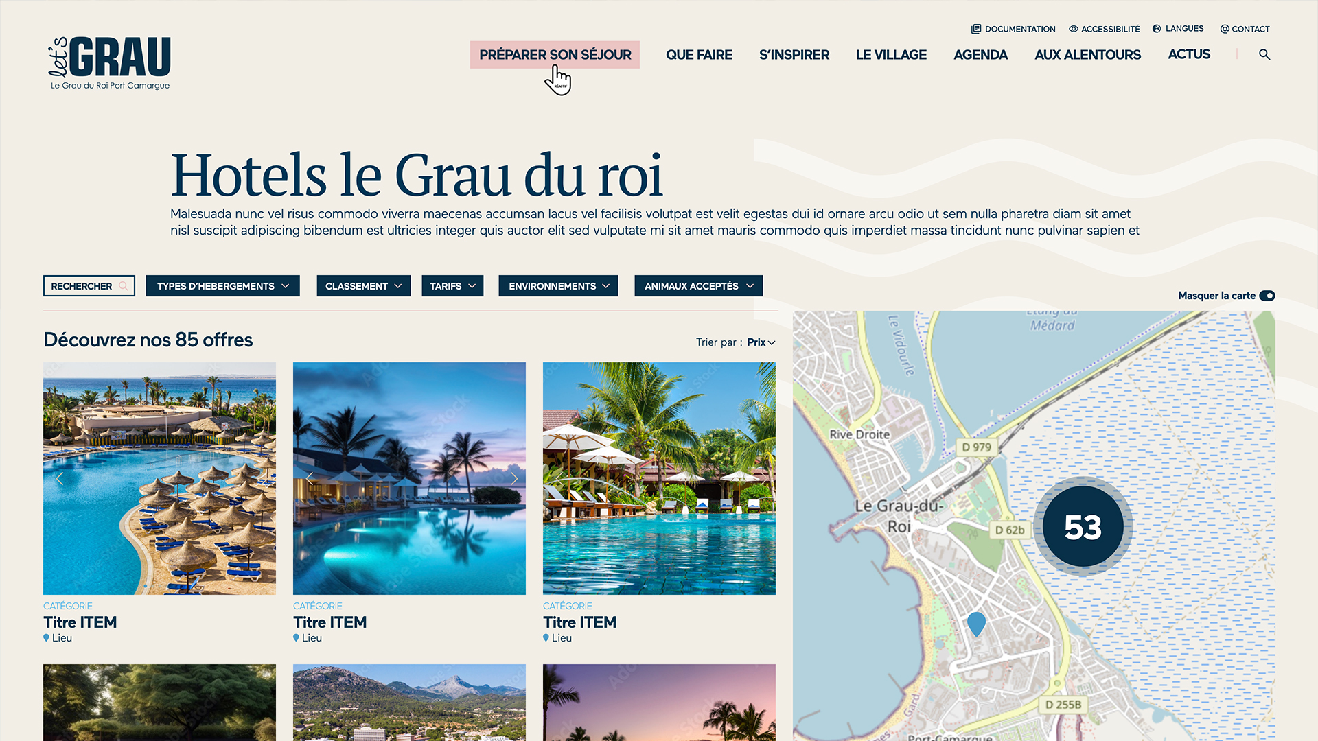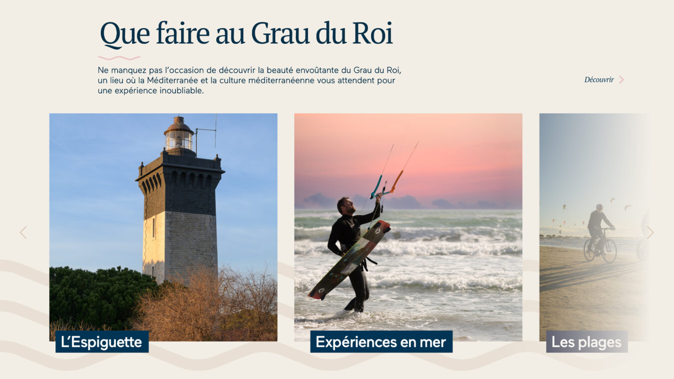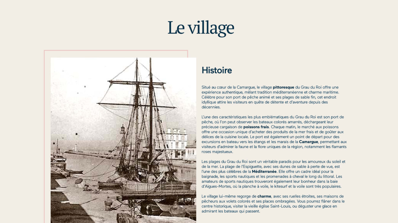 Le design du site letsgrau.com s’inspire directement de l’histoire du Grau-du-Roi, un ancien village de pêcheurs. Notre ambition était de transmettre l’authenticité et la poésie de ce lieu unique à travers une interface simple et élégante. Les couleurs douces et les éléments graphiques inspirés de la mer et des paysages locaux créent une atmosphère sereine et chaleureuse, invitant les visiteurs à découvrir une destination aussi charmante que pleine de traditions. Nous avons veillé à respecter l’âme du lieu tout en apportant une touche moderne et accueillante.